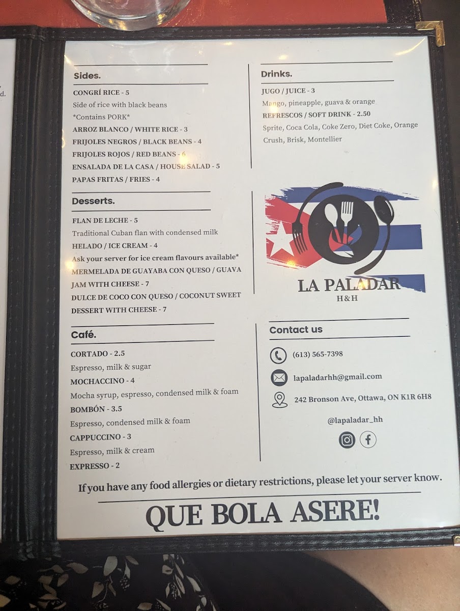 The front of this restaurant caught the eye of my group of friends. When lunchtime came around, we headed over. Inside the atmosphere was as expected, it has that Cuban charm with music, decor and Cuban scenes streaming on their screens. There is a good variety of dishes available. The lunchtime sandwiches are delicious and their prices are reasonable. This will definitely be a lunchtime spot the next time we're in Ottawa.